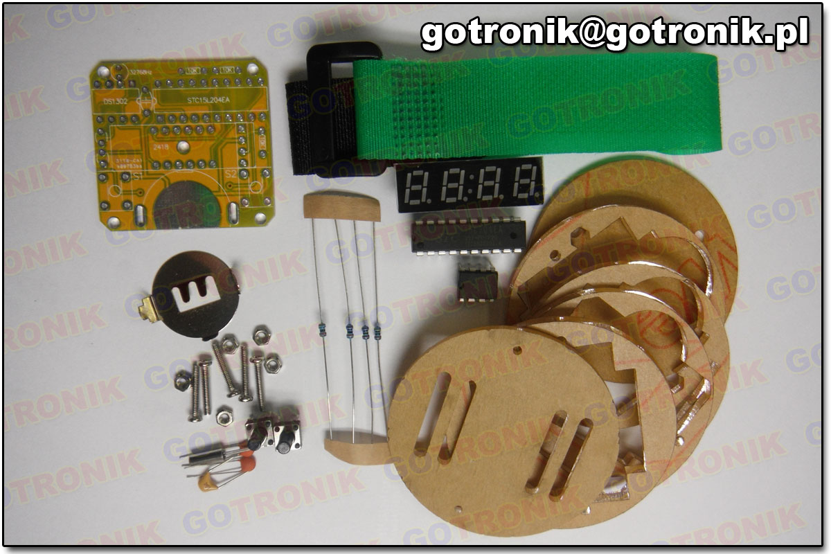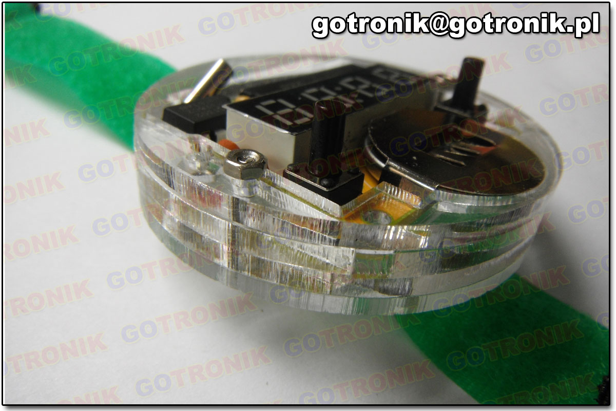 Przedstawiamy instrukcje montażu zegarka na rękę w przeźroczystej obudowie (numer katalogowy BTE-080). Własnoręcznie zmontowany, przezroczysty zegarek elektroniczny na pewno zrobi wrażenie na Waszych znajomych:). Układ zasilany jest napięciem 3 V. Należy dokupić baterię CR2025, ponieważ nie jest dołączona do zestawu. Zegarek posiada autouśpienie po upływie 5 sekund. Wyłączony jest wtedy wyświetlacz. Aby wybudzić go należy przycisnąć przycisk z lewej strony. Ważną informacją jest to, jak nastawić zegarek. Prawy przycisk trzymamy dłużej. Następnie migają pierwsze dwie cyfry (godziny), lewym przyciskiem ustawiamy żądaną wartość. Teraz ponownie przeciskamy prawy przycisk, aby prawym przyciskiem ustawić dwie kolejne cyfry (minuty). Aby zakończyć ustawianie, przyciskamy prawy przycisk. Gotowe. Alby sprawdzić, która jest godzina, wciśnij lewy klawisz (wybudzenie).