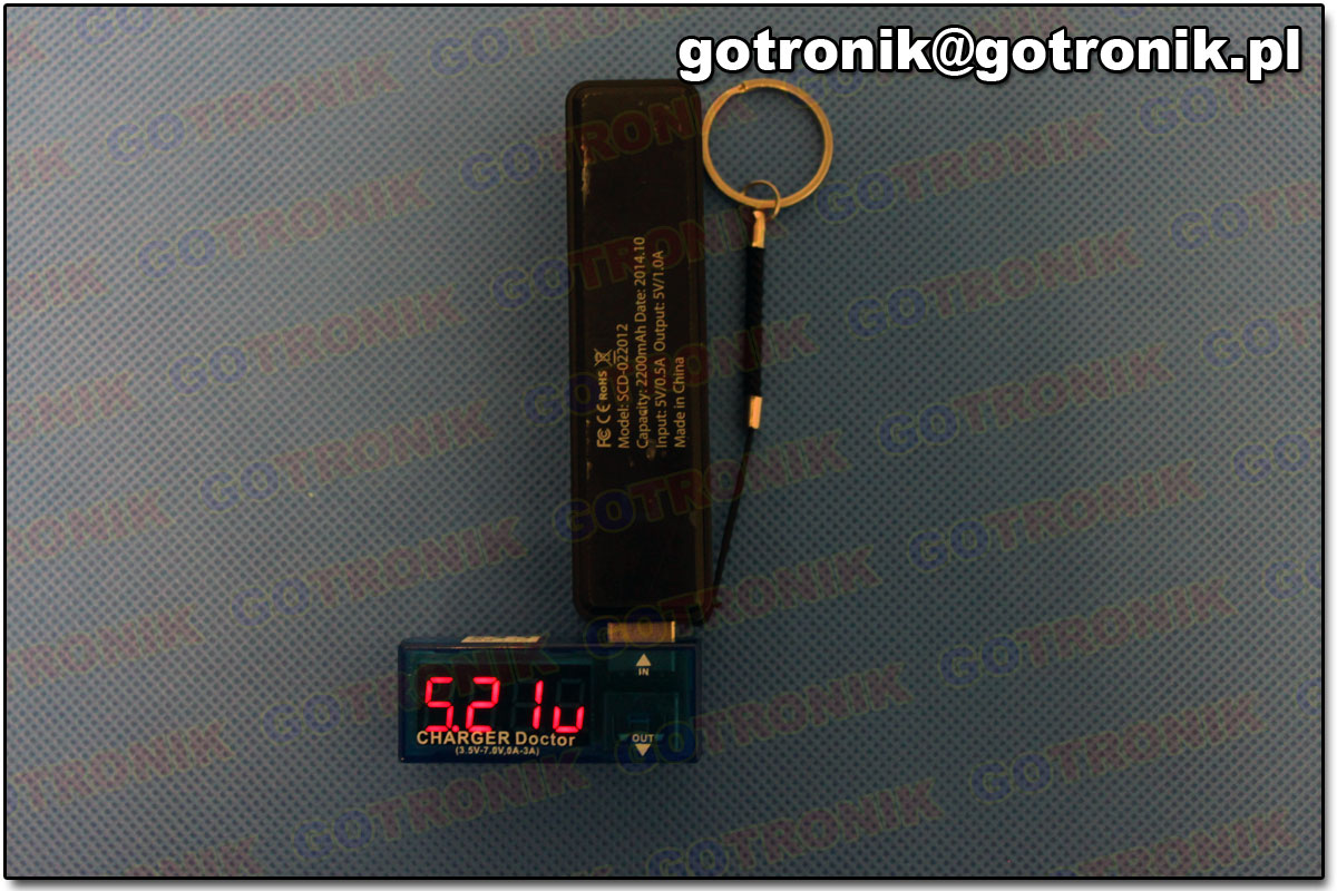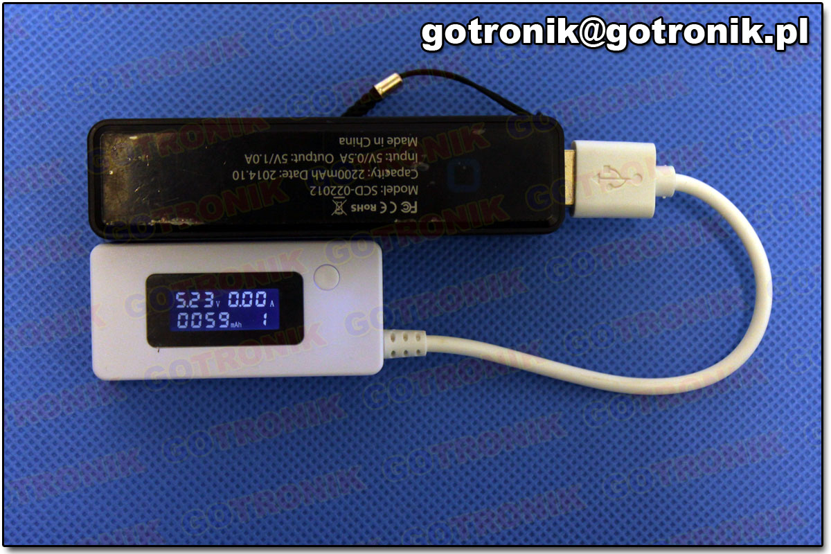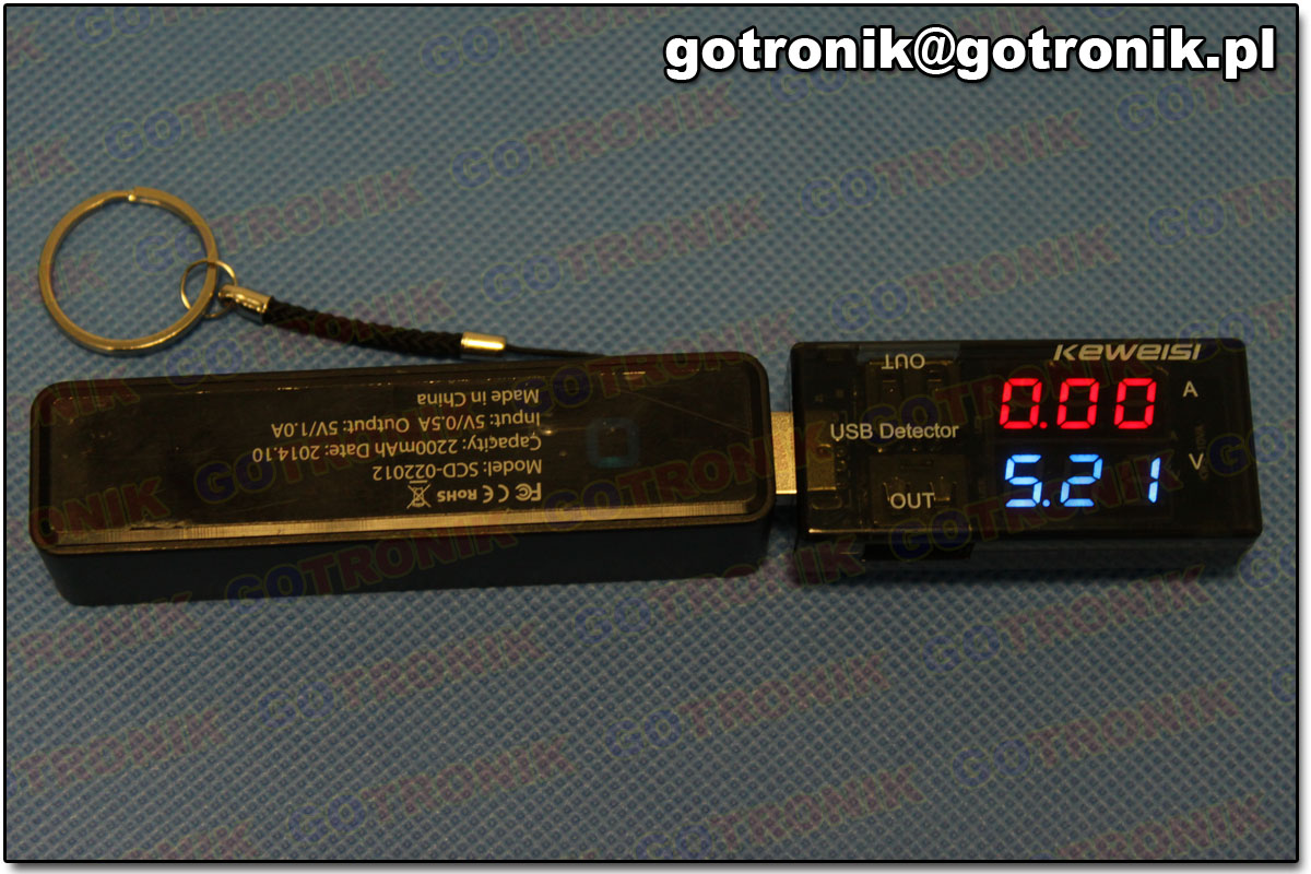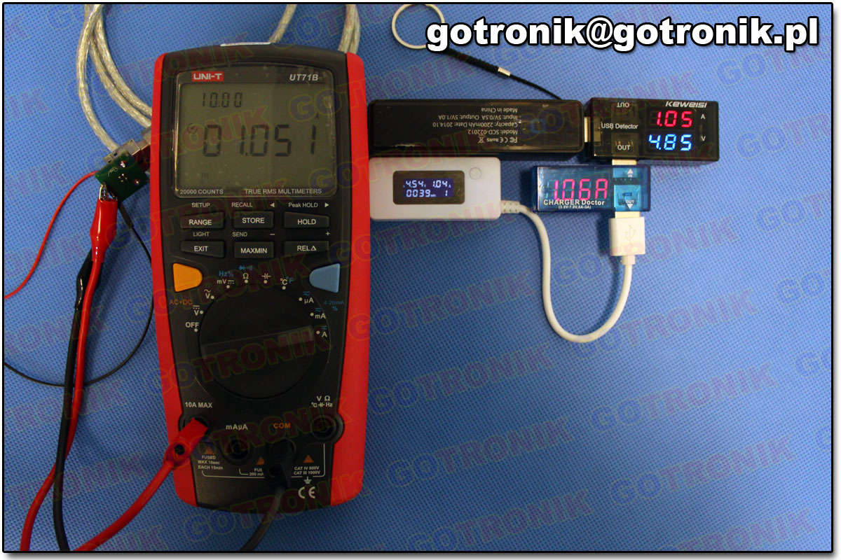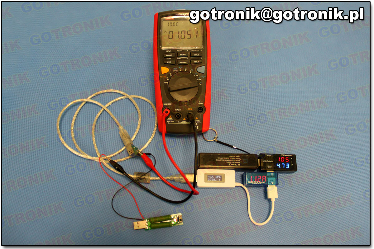 Pierwsze i trzecie urządzenie zostało wyposażone w wyświetlacz 7 segmentowy LED, natomiast drugie w wyświetlacz LCD. Keweisi model KWS-10VA wyróżnia się tym, że posiada 2 wyjścia USB: 1 wyjście do transmisji danych, a 2 do połączenia urządzenia USB pobierającego tylko zasilanie. Pozostałe dwa modele posiadają tylko jedno wyjście. Następnie przeprowadziliśmy dwa testy. Pomiar prądu, Połączono w szereg trzy wybrane modele i Power Bank. Do układu dodano obciążenie. Wynik pomiaru urządzeń (widoczny na zdjęciu) porównano z wynikiem otrzymanym z wyższej klasy multimetrem.