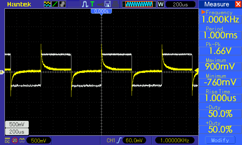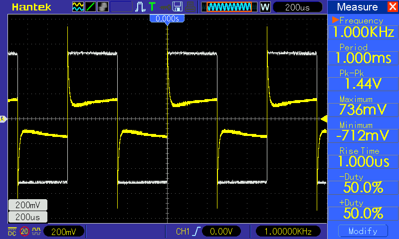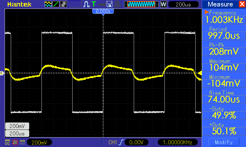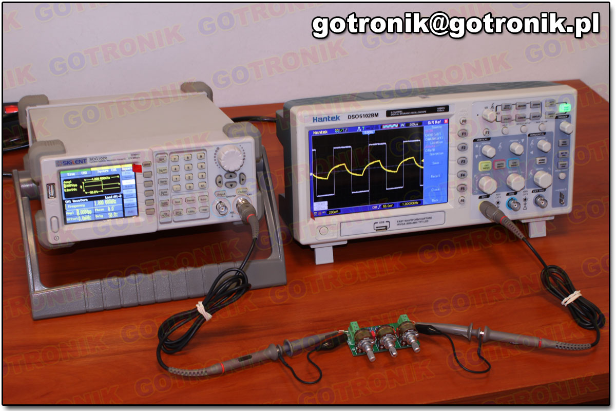 Podłączyliśmy regulator do generatora funkcyjnego Siglent SDG1020. Na wyjściu zaś podłączony został do oscyloskopu Hantek DSO5102BM. Do celów naszych badań wykorzystaliśmy tylko jeden kanał. Jest to przedwzmacniacz stereo, a wiec drugi kanał jest całkowicie symetryczny. Dzięki przydatnej funkcji w oscyloskopie byliśmy w stanie zapisać nasz przebieg wzorcowy w pamięci (SAVE/RECALL → Ref → Save → Recall) kolor szary i na niego nakładać zmienione przebiegi w zależności od wysterowania poziomu tonów niskich i wysokich, kolor żółty . Bezpośrednie zrzuty z oscyloskopu, możliwe dzięki wbudowanemu wejściu USB, zamieszczone są poniżej.