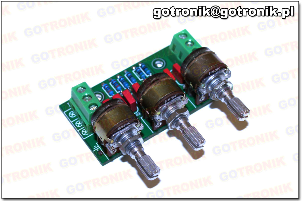 W dniu dzisiejszym otrzymaliśmy za zadanie zbadanie prostego układu do regulacji barwy dźwięku w torze audio. Jest to moduł pasywny nie wymagający zewnętrznego zasilania. Dostępny jest on w sprzedaży na stronie gotronik.pl pod numerem katalogowym BTE-478. W praktyce jest to pasywny preamp stereo czyli przedwzmacniacz, który możemy umieścić tuż przed końcówką mocy audio w celu regulacji siły głosu (wzmocnienia) i barwy dźwięku (regulacja tonów niskich i wysokich).