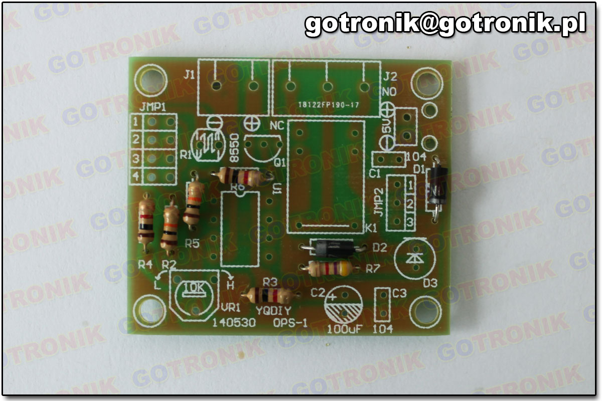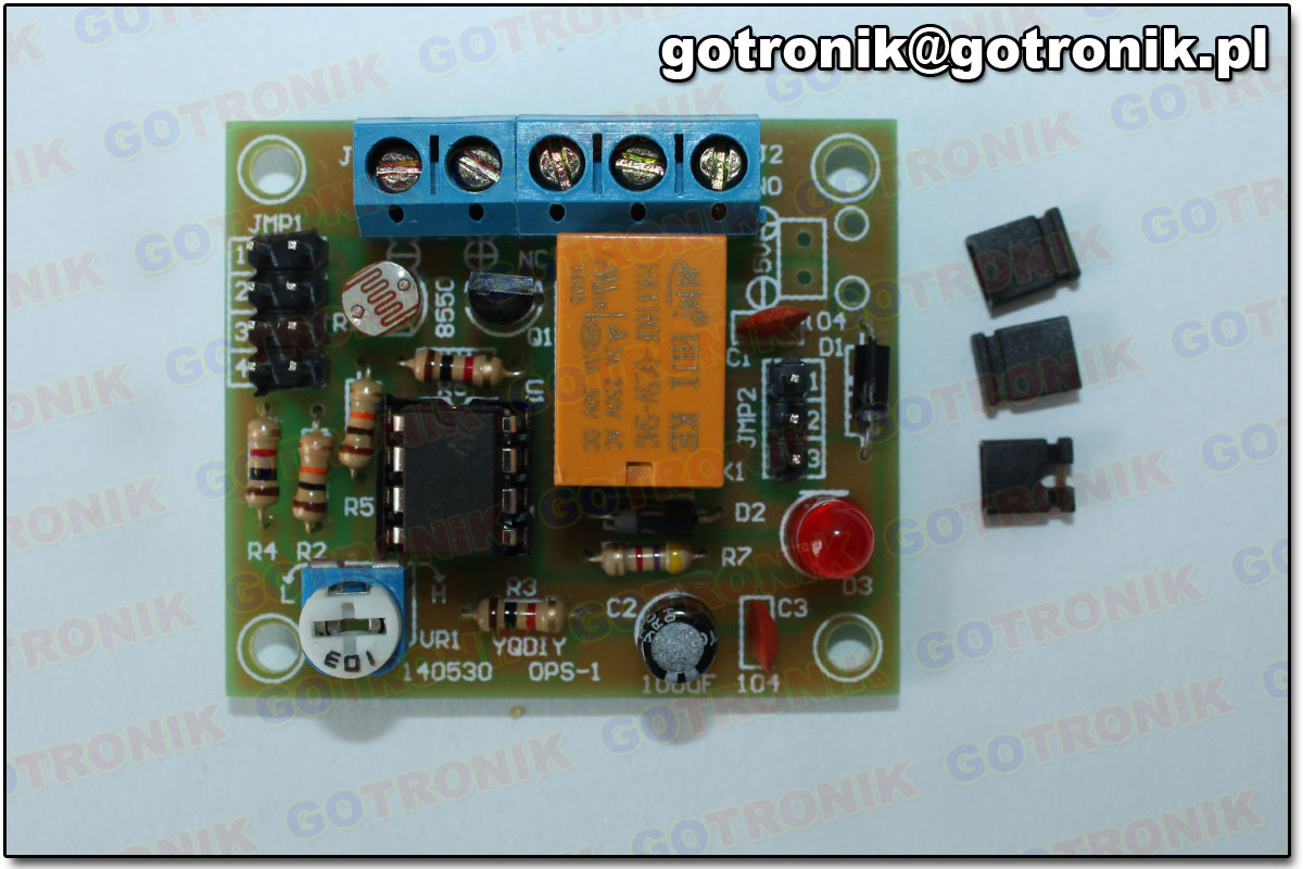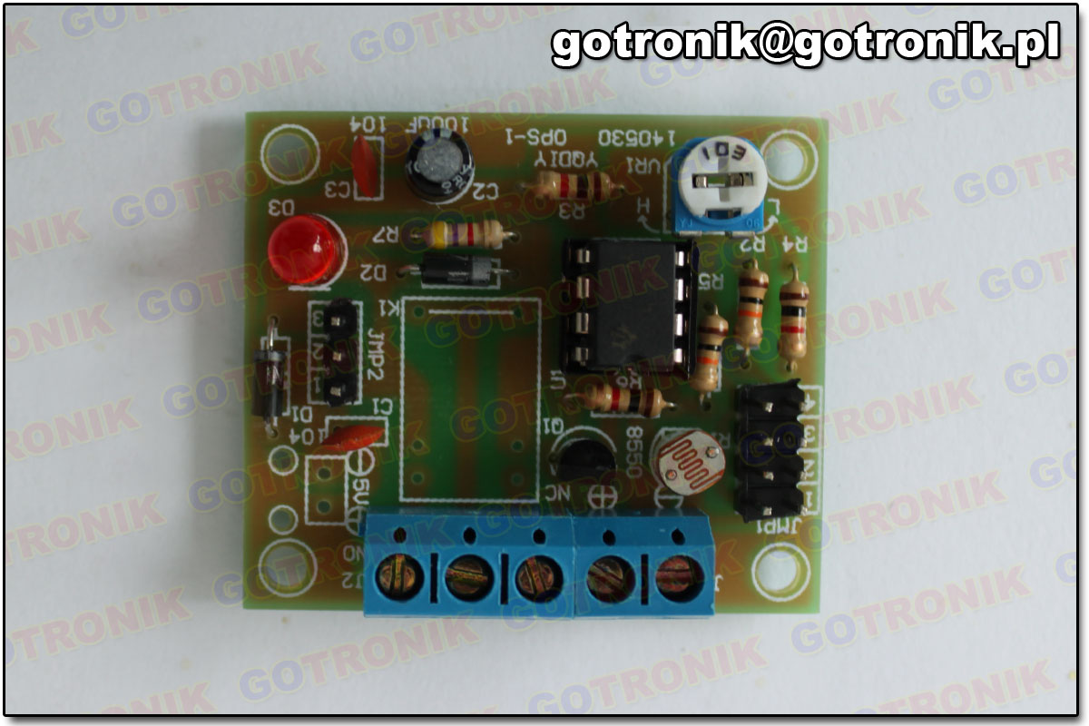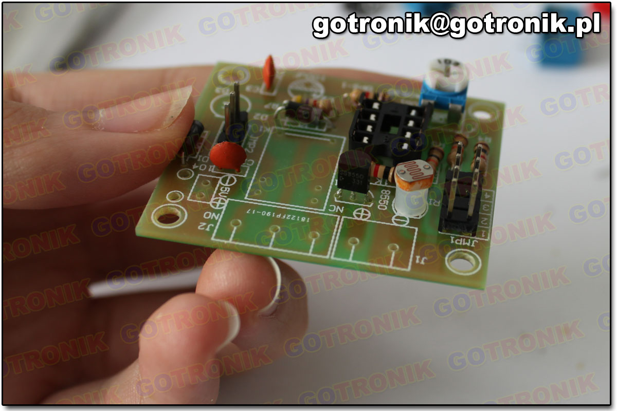 Pokażemy jak zmontować własny moduł z przekaźnikiem sterowany światłem. Przyjrzymy się jego możliwością, a następnie pokażemy instrukcję krok po kroku. Układ wymaga zasilania prądem stałym w zakresie od 5 do 6 V. Pobierany prąd spoczynkowy wynosi 1,5 mA, natomiast maksymalny prąd obciążenia wynosi 400 mA. Moc maksymalna jest równa 300 W. W zestawie zawarto trzy zworki, którymi wybieramy odpowiednio tryby działania modułu. Na JMP1 wybieramy czy przekaźnik ma być wyłączony w ciemności i włączony w jasnym otoczeniu (umieszczamy jedną zworę w rzędzie pierwszym i drugą zworkę w rzędzie trzecim), czy wyłączony w jasnym otoczeniu i włączony w ciemnym (umieszczamy jedną zworę w rzędzie drugim i drugą zworkę w rzędzie czwartym). Na JMP2 wybieramy czy przekaźnik działa (zakładamy zworkę pomiędzy pin 1 i 2) czy nie (zakładamy zworkę pomiędzy pin 2 i 3).