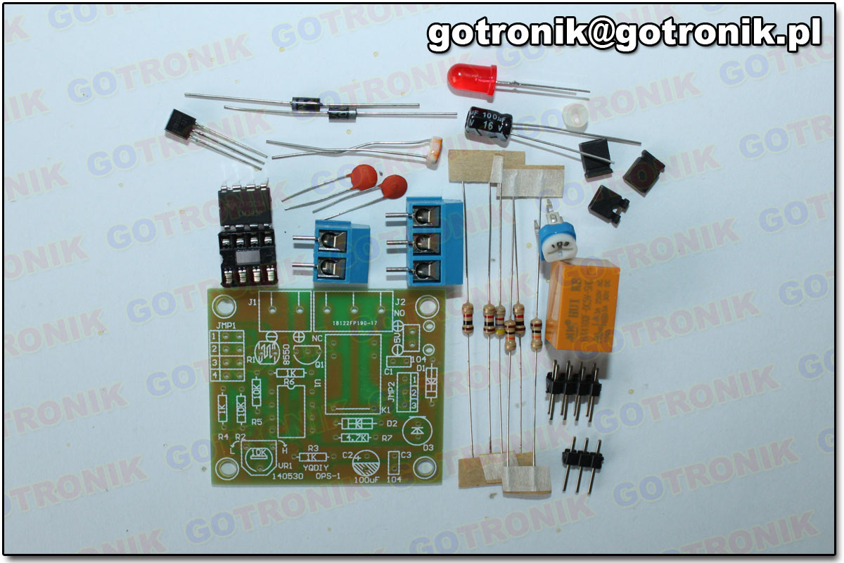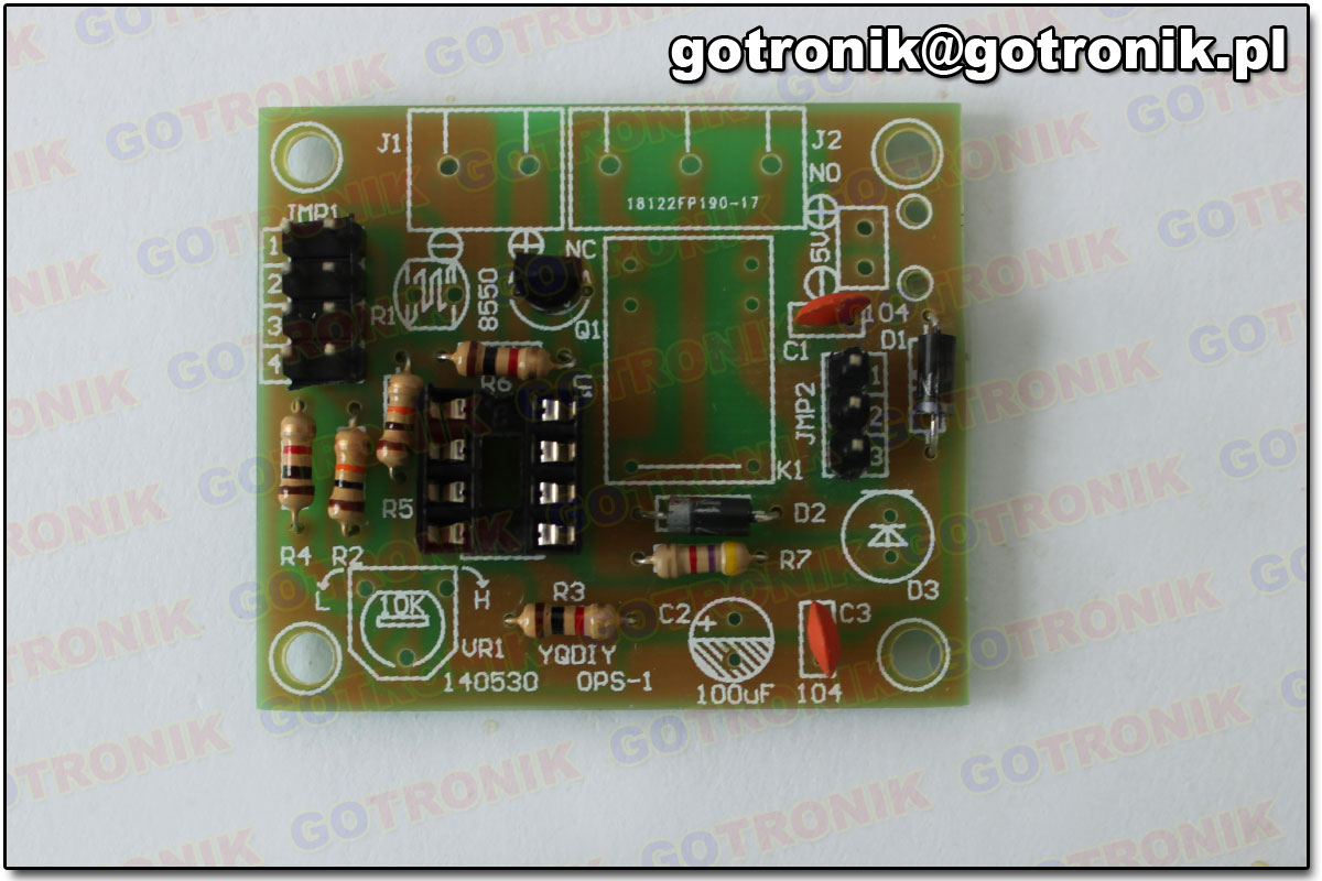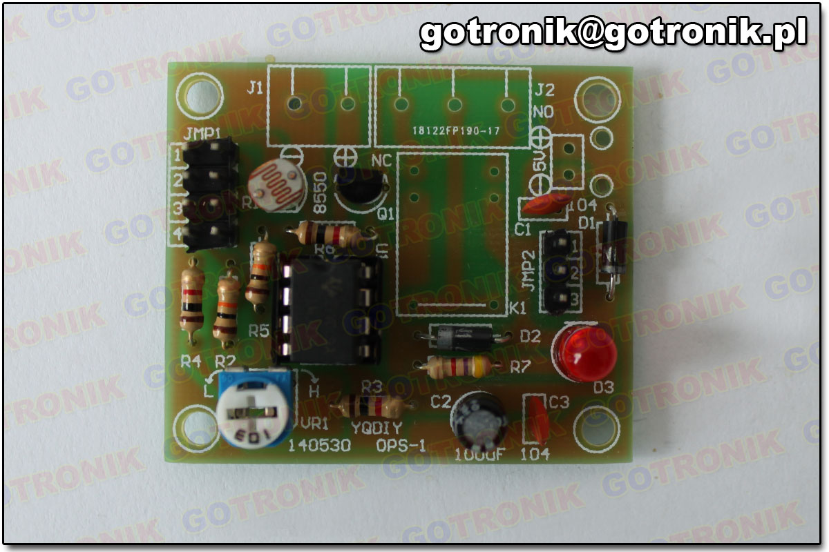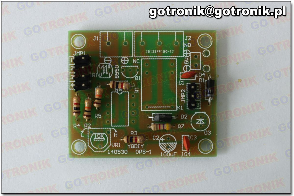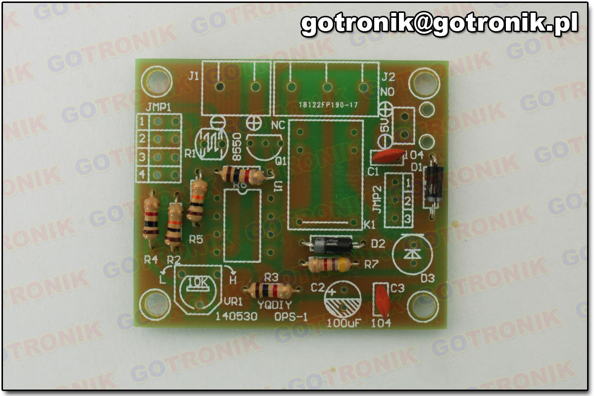 Pokażemy jak zmontować własny moduł z przekaźnikiem sterowany światłem. Przyjrzymy się jego możliwością, a następnie pokażemy instrukcję krok po kroku. Układ wymaga zasilania prądem stałym w zakresie od 5 do 6 V. Pobierany prąd spoczynkowy wynosi 1,5 mA, natomiast maksymalny prąd obciążenia wynosi 400 mA. Moc maksymalna jest równa 300 W. W zestawie zawarto trzy zworki, którymi wybieramy odpowiednio tryby działania modułu. Na JMP1 wybieramy czy przekaźnik ma być wyłączony w ciemności i włączony w jasnym otoczeniu (umieszczamy jedną zworę w rzędzie pierwszym i drugą zworkę w rzędzie trzecim), czy wyłączony w jasnym otoczeniu i włączony w ciemnym (umieszczamy jedną zworę w rzędzie drugim i drugą zworkę w rzędzie czwartym). Na JMP2 wybieramy czy przekaźnik działa (zakładamy zworkę pomiędzy pin 1 i 2) czy nie (zakładamy zworkę pomiędzy pin 2 i 3).