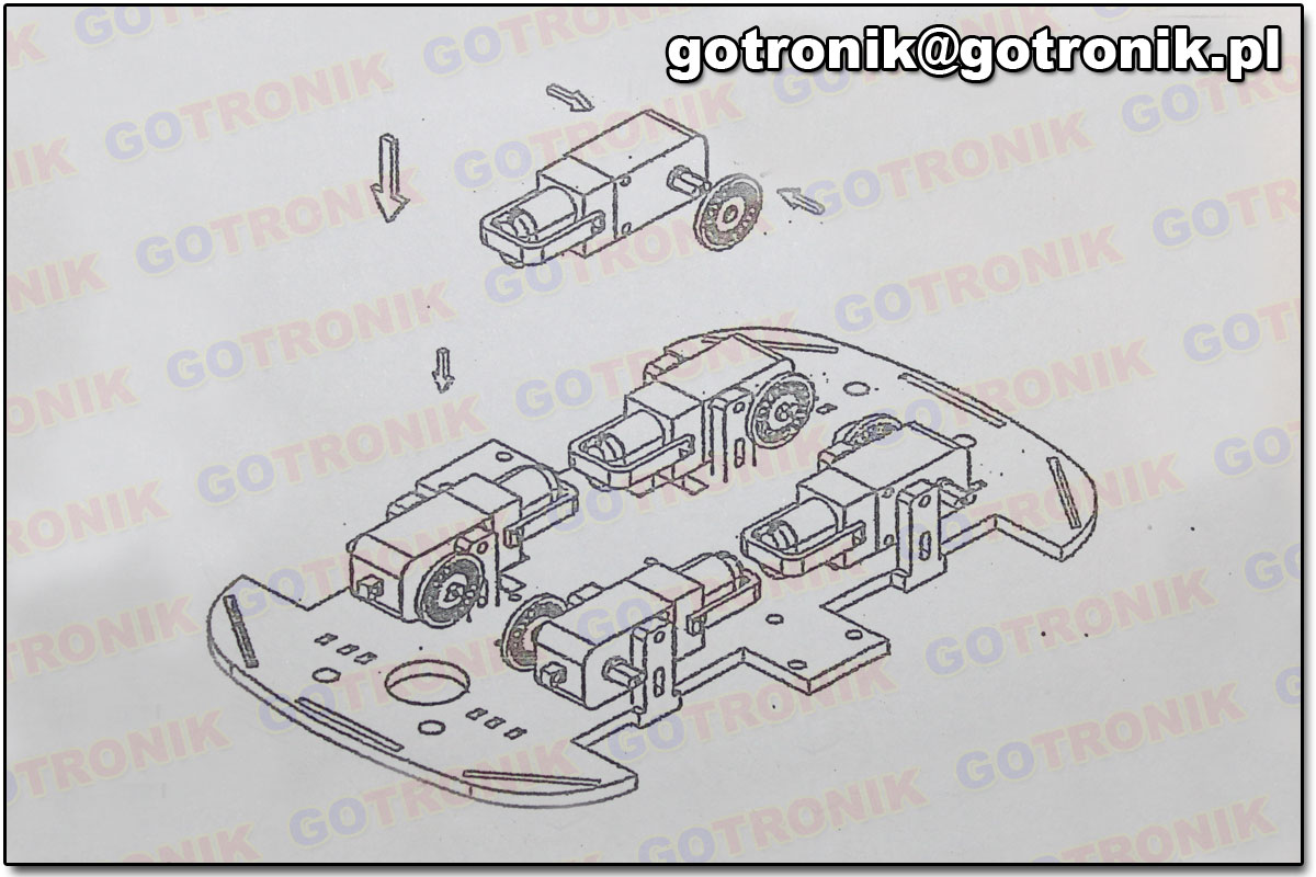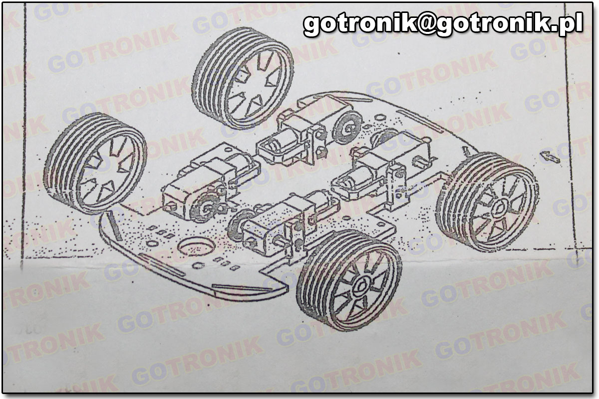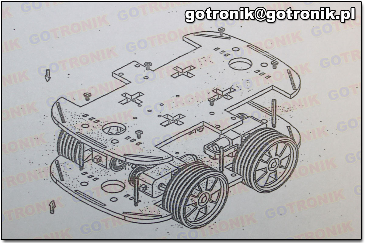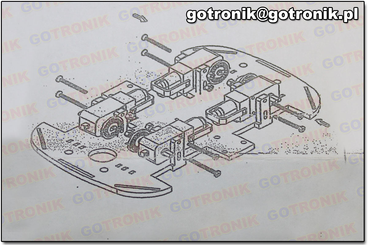 Przedstawiamy instrukcję montażową podwozia robota – samochód. Zestaw do postawą do zbudowania własnego robota. Po dołączeniu części elektronicznej, robot może służyć do pomiaru odległości lub prędkości, do śledzenia linii, omijania przeszkód. Jeśli jesteś zaawansowanym elektronikiem możesz nawet pokusić się o zaprojektowanie bezprzewodowego sterowania do robota. Wymiary samochodu wynoszą 22 x 12 cm (długość x szerokość). Wymiary kół wynoszą 6,5 x 2,7 cm (średnica x szerokość opony). Silniki zawarte w zestawie wymagają zasilania od 3 do 6 V DC prądu stałego, a prędkość maksymalna jaką możemy uzyskać wynosi 48 m/min. Sprawdź zawartość opakowania z poniższą listą oraz przyjrzyj się liście wymaganych narzędzi, bez których ukończenie montażu jest niemożliwe.