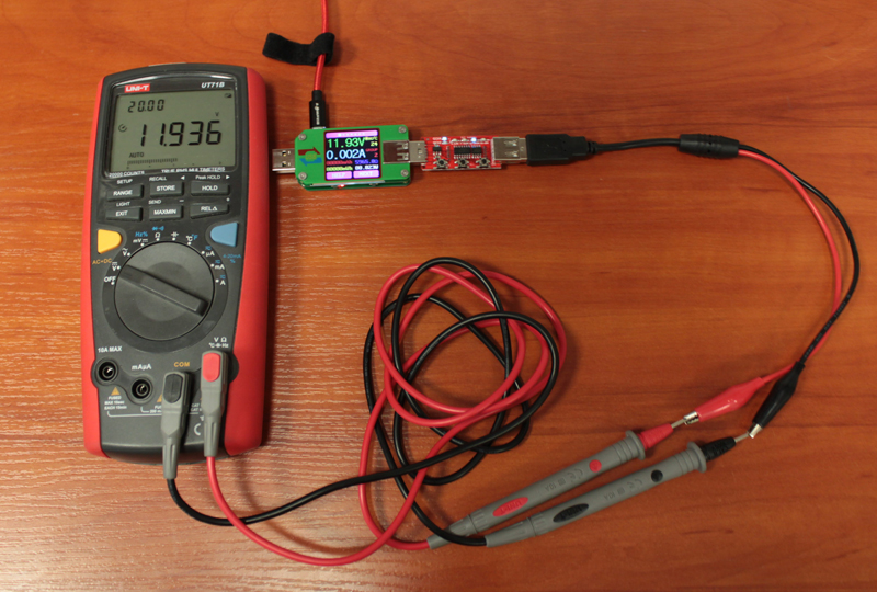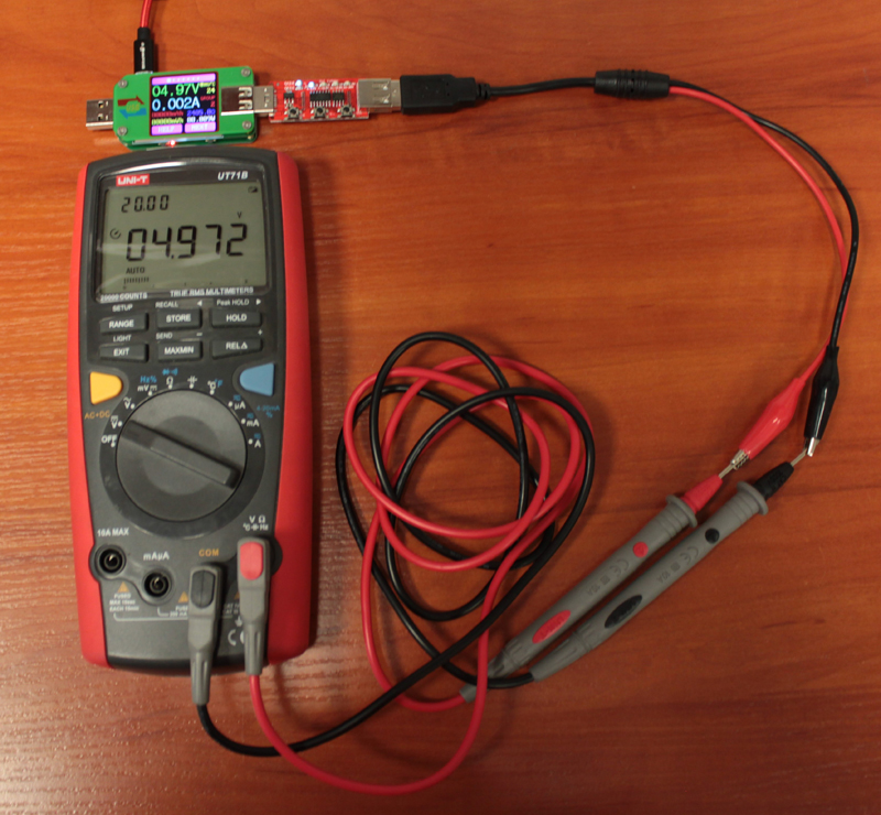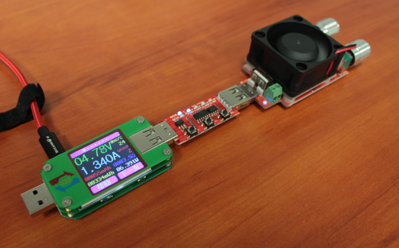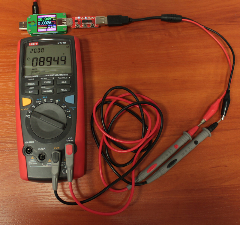 Poniżej został zaprezentowany układ, w którym moduł wyzwalacza od strony wejściowej został podłączony do szybkiej ładowarki Blitzwolf poprzez miernik portu USB UM24 a od strony wyjściowej do woltomierza. Celem tych pomiarów jest oszacowanie dokładności badanego wyzwalacza. Na module BTE-363 zostały ustawione wartości napięcia: 12V, 5V i 9V. Wybranie napięcia o wartości 20V nie było możliwe ze względu na ograniczenia ładowarki, która niestety nie obsługuje tak wysokiego napięcia.